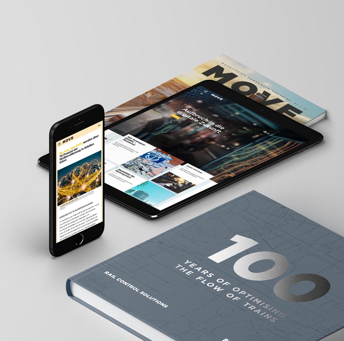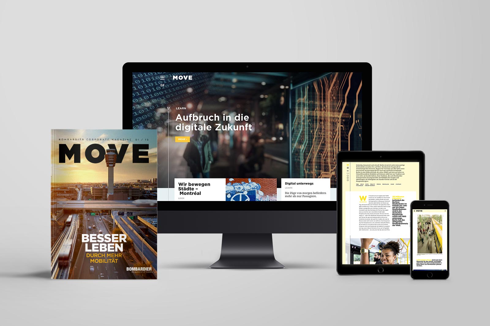 Gemeinsam mit Bombardier haben wir das Konzept Move als multimediale Kommunikationslösung für das Unternehmen entwickelt. Im Mittelpunkt des Konzepts steht die digitale Content-Plattform Move sowie eine Content-Datenbank, aus der alle Kanäle und Stakeholder optimal mit massgeschneidertem Content bedient werden können. Ergänzend erscheint die Printausgabe von Move zu bestimmten Anlässen wie Messen, Fachtagungen oder Brachen-Events.